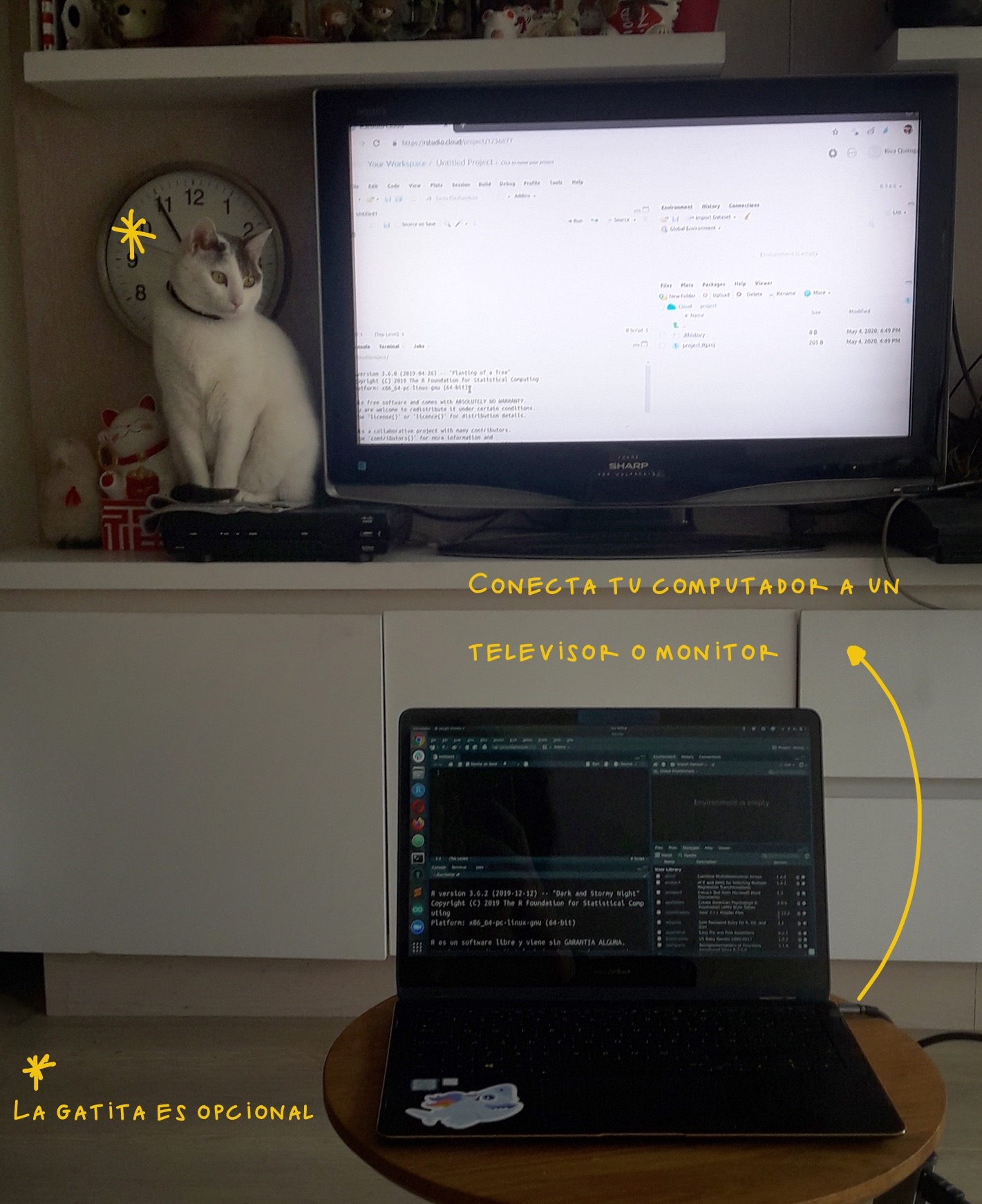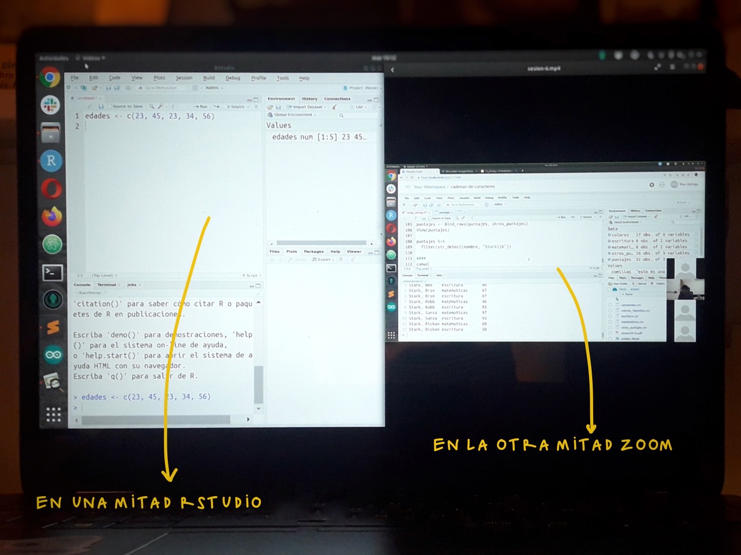 Este es un taller práctico en el que escribiremos “código en vivo”, es decir, mostraremos todo el proceso de escritura y ejecución del código. Lo ideal es que vayas replicando en tu computador todo lo que hagamos. Para ello, es necesario que pienses en alguna configuración de pantalla que te permita ir mirando lo que hacemos en Zoom y replicándolo en RStudio.