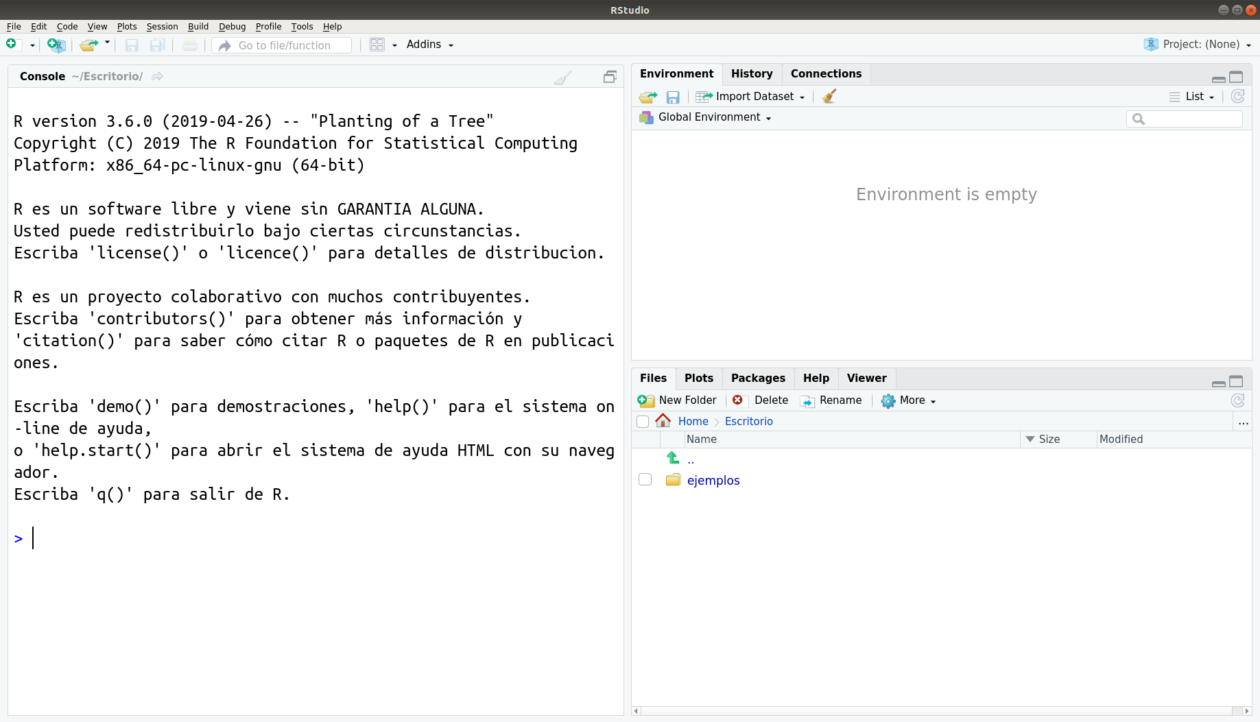 Si quedó todo bien instalado, cuando abras RStudio deberías ver algo parecido a esto (algunas cosas pueden variar según tu sistema operativo):
